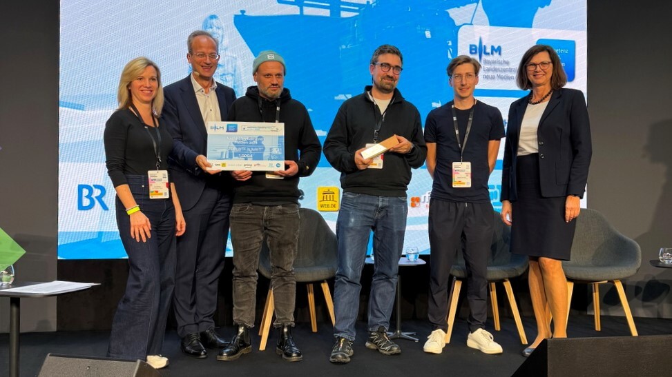 (Foto oben: Das Winner-Team des ZDF und von FLAPPERS FILM bekommt von Landtagspräsidentin Ilse Aigner (re.) und BLM-Präsident Dr. Thorsten Schmiege (2.v.l.) den Nachhaltigkeitspreis Medien; Foto: Medien.Bayern GmbH/MEDIENTAGE MÜNCHEN)